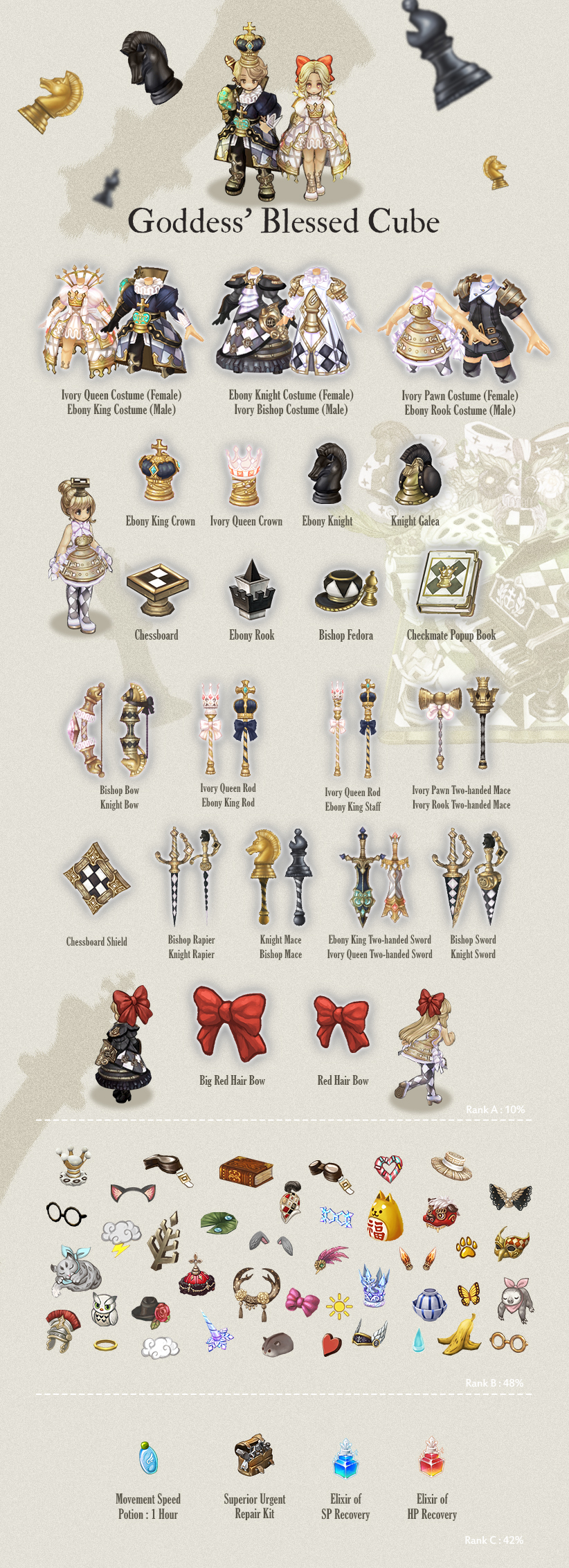 Importante: Todos los Goddess' Blessed Cubes siguen la lista de objetos actualizados sin importar la fecha de compra. Esta política es estándar a menos de que se mencione lo contrario. por ejemplo, Goddess' Blessed Cube A (comprado en Noviembre de 2016), B (comprado en Enero de '17) y C (comprado en Mayo de 2017) todos seguirán la lista más actual de objetos.